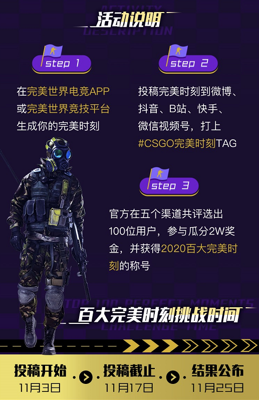 自动抓取比赛高光时刻,一键生成配乐短视频,国服全新功能——“完美时刻”自上线以来,已收到了数以万计用户的记录和分享。今日“百大完美时刻”评选活动正式开启,在抖音、快手、B站、微博、微信视频号中的任意平台,添加#CSGO完美时刻#话题,发布自己的完美时刻视频,即可参与活动。最终经过官方评选,将有100位用户的完美时刻荣登百大榜,共同瓜分2万元的总奖金!