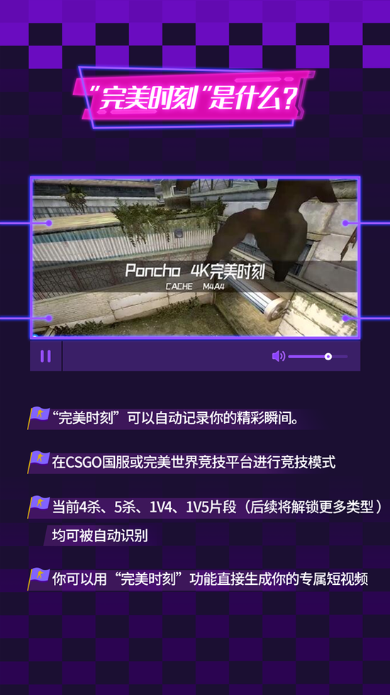 CS:GO官方对战平台——完美世界竞技平台的原创特色功能“完美时刻”自上线以来,已收到了广大玩家们的热烈好评。然而在日常对战中,手感爆棚经常发生,玩家们想记录的高光时刻有时会受到生成次数的限制,为了让玩家们有机会记录更多的精彩操作,从本周起,在官方平台每周的完美时刻生成次数免费增加到7次!