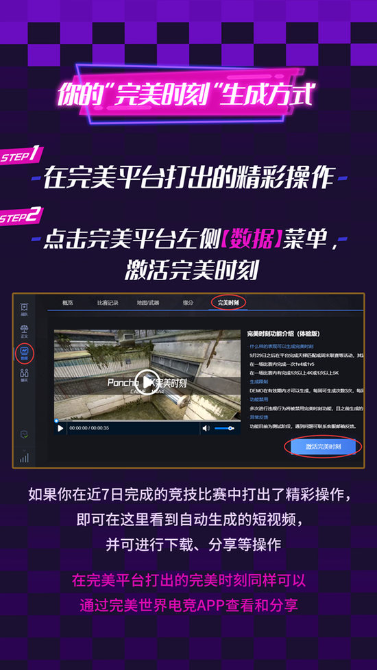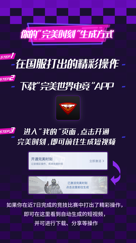 你精彩的灭队操作、某次有如神助的爆炸手感、想要分享给朋友的难忘瞬间……无需下载demo,无需剪辑配乐,完美时刻一键帮你搞定!