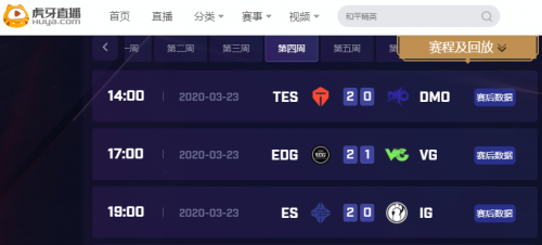 3月23日,虎牙LPL春季赛常规赛第四周第一个比赛日正式开战。首战TES迎战DMO,面对弱旅DMO,TES重拳出击,上单369剑魔两把天神下凡,轻松2:0拿下DMO,结束了自己的连败。第二场EDG激战VG,双方上中野肉搏三把,Hope女枪拿下五杀,最终EDG更胜一筹,2比1拿下VG。第三场ES对IG头名之战,针尖对麦芒之战,本以为老牌强队IG能够将新军ES斩落马下,结果出人意料,ES两局指挥出色,大比分碾压IG,打破IG不败金身,登顶2020LPL春季赛积分榜!