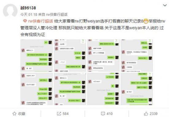 1、在今天凌晨,网友突然在微博中发布消息,曝光了RW打野选手weiyan的假赛聊天记录,并表示由于管理层没人管冷处理才将聊天记录公布出来。