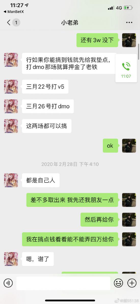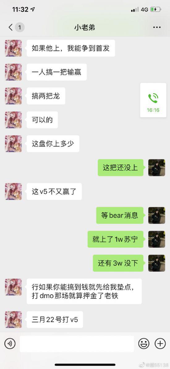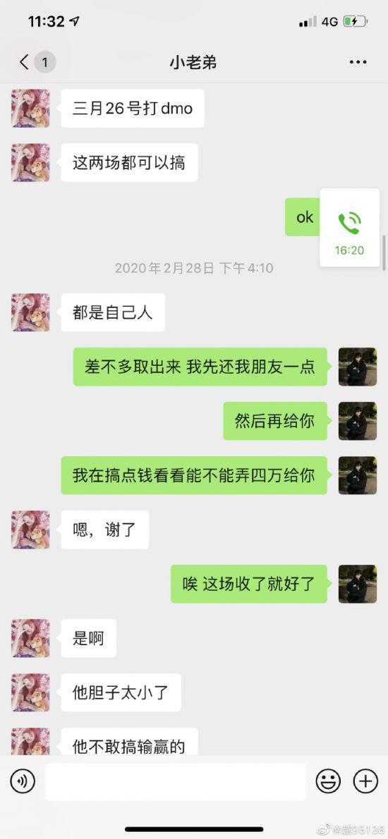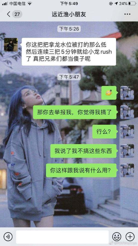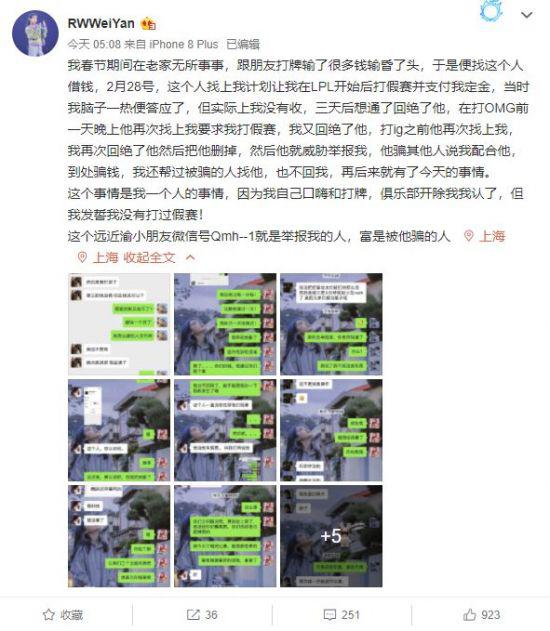 2、然而,就在此事被曝光不久后,weiyan本人做出了回应,他表示自己前段时间因为打牌输昏了头,有人找到他让他打假赛,并且支付定金,当时脑子一热便答应下来,不过考虑后还是决定不打假赛给拒绝了。但对方不依不饶,先后在OMG与iG的比赛前找到weiyan并要求其假赛,如果不打的话就曝光聊天记录,weiyan也明确拒绝了,于是才有了后面曝光的事件。