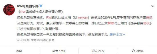 经俱乐部调查核实,RW战队队员王湘(id:weiyan)在参加2020年LPL春季赛期间存在严重违纪及违规行为。对此,俱乐部秉承一贯零容忍的态度,即日起正式解除与王湘的《选手服务协议》并将资料同步至LPL联盟处理。