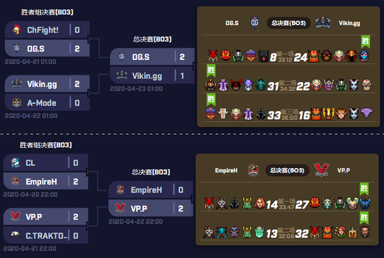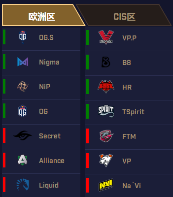 在欧洲区预选赛中,OG.S先是2:0战胜ChFight!这匹黑马,随后在被碾压先失一城的情况下扳回两局击败了Vikin.gg战队,获得晋级资格。而CIS区延续了独联体一贯的“人狠话不多”,三场利落的2:0展现了速战速决的风格,最终VP.P带走EmpireH顺利晋级。