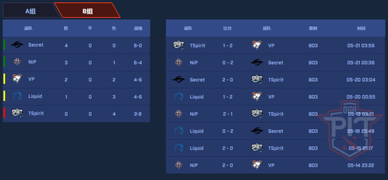 Secret还是保持着大魔王的恐怖状态,4-0大比分8:0小比分一小场未败,对阵Liquid战队第一场三圣剑翻盘也让人看得血压拉满,而在5月21日凌晨对阵NiP的两场比赛中,Nisha操刀的POM和水人分别获得了10/0/8和17/0/8的战绩,两场0死亡。VP这次小组赛的成绩不是很理想,第三名让他们只能从败者组开始打,不过值得一提的是,他们终于2:1战胜了自己的克星Liquid战队。
