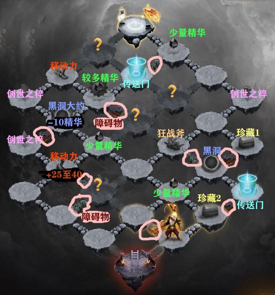 一共48条路,其中随机10条路左右上有障碍物,个人感觉障碍物在珍藏或创世之粹的点出现概率要高一些。珍藏出现在两通点概率较大,也可能出现在三通点。在两通点遇到障碍物建议使用斧头,不然看情况绕路。撞了障碍物就已经-8移动力,斧头用在两通点更划算一些。