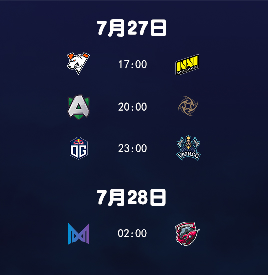更为激烈的欧洲区比赛将于7月27日17:00开赛,VP、Navi、Alliance、NiP、OG、VK.GG、Nigma和FTM8支队伍将展开新一轮的厮杀。没有Secret大魔王的加入,比赛也更多了一份变数与悬念。