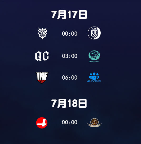接下来,美洲和欧洲区的比赛,还将继续陪伴大家度过炎炎酷暑。首先迎来的是美洲区的比赛,北京时间7月17日0:00,Thunder迎战Midas,吹响美洲区淘汰赛的号角。除去这两支队伍,参加比赛的还有Quincy Crew、beastcoast、Infamous、business associates、CR4ZY和4 Zoomers 6支队伍,具体第一轮赛程如下图所示。