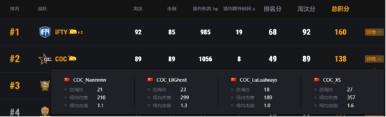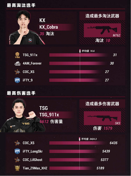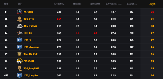 从淘汰榜上来看,前10中iFTY战队有三名队员上榜,可见他们强大的个人能力。除此之外,TSG战队也有两人上榜,队内选手TSG_911x更是拿到了31个淘汰数排名第二,场均伤害高达367,位列决赛阶段的场均伤害第一,是战队的可靠火力来源。