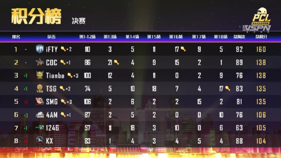 21天的激烈角逐,随着TSG战队拿下最后一场比赛的胜利,本次2020PCL夏季赛圆满结束。iFTY战队众望所归,一路保持优势并超强发挥以160的总积分拿下本次PCL夏季赛冠军;赛前的最大黑马COC战队尽显黑马本色,凭借最后一天的出色发挥后来居上拿下第二名的好成绩;赛前夺冠热门天霸战队发挥的也是可圈可点,总积分138分和第二名的COC战队同分,但由于淘汰数略低于COC战队而位列第三;第四、五名分别为TSG和SMG,两队同为135分,TSG凭借总淘汰数比SMG战队高两分排名第四,SMG获得第五名。最后一个PCS2东亚洲际赛出线名额被4AM战队收入囊中,他们再一次在最后一把上演绝地翻盘,超越竞争对手以一分险胜拿到第六名。