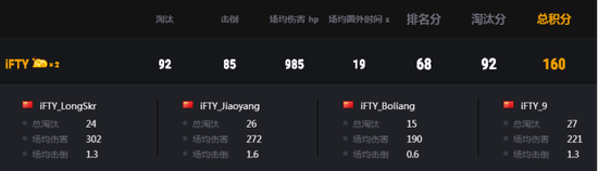 从数据上看,除去断后位Boliang,其余三人非常平均,四人配合随着比赛进行越加默契,其中新人小9进步神速,在决赛阶段调整了自己的打法,斩获27个淘汰数,为iFTY战队贡献了自己的一份力。