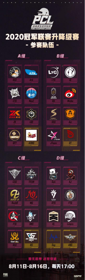 2020PCL夏季赛刚落下帷幕,PCLP(PCL升降级赛)即将隆重开赛!8月11日至8月16日,32支战队为了晋级PCL秋季赛的4个名额,将进行为期6天的激烈角逐。参赛队伍中不乏我们的老朋友,春季赛冠亚军Lstars和LYG战队都将为重回冠军联赛而奋斗;曾经的“亚洲狙神”211带领的SSS将为升级名额发起冲击;重组起航的weibo战队能否突出重围;老将小秋和yyangkk能否为XJ战队拼出最后一份力;从PDL打上来的五支队伍能否继续上演黑马本色,完成二级跳。精彩继续,奇迹不停,让我们共同期待各支战队的出彩表现吧!